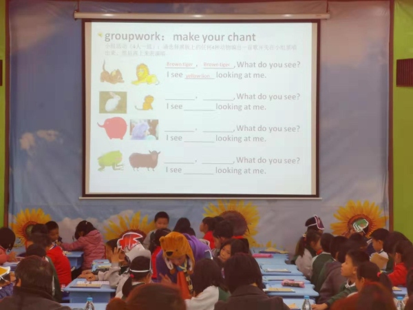 本次同課異構(gòu)教研活動,由我校方珊丹老師和育才學(xué)校的黃贊斐老師承擔(dān)授課任務(wù)。授課內(nèi)容是Bill Martin Jr/Eric Carle 的繪本 《Brown Bear, Brown Bear, What do you see ?》。第一節(jié)課由神灣中心小學(xué)的方珊丹老師執(zhí)教,上課班級是四年級2班。方老師借助“變魔術(shù)”游戲、動物頭套等創(chuàng)設(shè)真實情景,讓學(xué)生快速且快樂地學(xué)習(xí)繪本中出現(xiàn)的顏色和動物單詞,接著通過拍唱的方式,將整個繪本的內(nèi)容娓娓道來。第二節(jié)課由育才學(xué)校的黃贊斐老師執(zhí)教,上課班級是四年級3班。黃老師借助“識動物”游戲以及豐富的肢體語言,吸引學(xué)生興趣,提高學(xué)生的課堂參與度。兩位老師課前準(zhǔn)備充分,課上激情飽滿,為我們展示了兩堂精彩的課例。