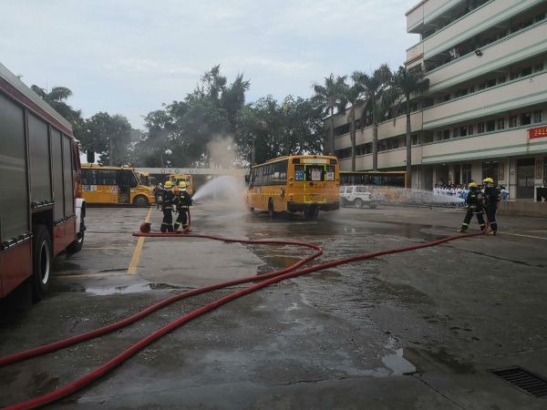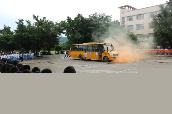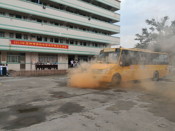 演練分兩個(gè)科目進(jìn)行,科目一是宣傳教育。由神灣鎮(zhèn)交警大隊(duì)彭曉藍(lán)警官講解校車安全事故中逃生知識(shí)。彭警官為學(xué)生講解了校車起火時(shí)的撤離、校車碰撞時(shí)的自我防護(hù)、被困車內(nèi)時(shí)逃生錘的使用以及校車逃生門的使用,讓同學(xué)們受益匪淺。接著進(jìn)行了科目二的實(shí)景模擬演練中,一輛校車從校門駛?cè)胄@停車場,突然有一名學(xué)生發(fā)現(xiàn)校車的尾部冒出“濃煙”,立即大聲報(bào)告:“汽車著火啦!”,司機(jī)聽到報(bào)告后迅速停車,熄匙,打開車門。跟車?yán)蠋熈⒓聪驅(qū)W生大聲通知:“車著火!大家鎮(zhèn)定!聽從指揮,要快速有序地下車!” 所有學(xué)生立即解開安全帶,引導(dǎo)老師利用應(yīng)急手動(dòng)開關(guān)打開乘客門和應(yīng)急門,跟車?yán)蠋煱l(fā)布指令:“車輛起火,立即疏散,聽從統(tǒng)一指揮,不擁擠?!睂W(xué)生們彎著腰,用毛巾、衣物捂著嘴鼻迅速有序地從逃生門和前車門及時(shí)撤出,快速撤離到距離校車50米外的安全區(qū)域集合,校領(lǐng)導(dǎo)接到報(bào)告后馬上報(bào)警,消防車迅速趕到現(xiàn)場滅火,交警隨即趕到現(xiàn)場指揮交通,醫(yī)院醫(yī)生也趕到現(xiàn)場救護(hù)受傷學(xué)生,跟車?yán)蠋熐妩c(diǎn)學(xué)生人數(shù)上報(bào)總指揮,全程緊張有序。