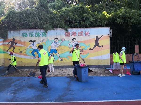 此次活動(dòng)分為兩個(gè)校區(qū)開展。高家基校區(qū)與煙墩校區(qū)分別在校區(qū)所在區(qū)域半徑100米范圍內(nèi)開展市容衛(wèi)生、創(chuàng)文宣傳等活動(dòng)。在黃榮勝校長的積極引領(lǐng)下,全體行政與教師全副武裝——穿上志愿服,戴上手套,手持掃把、垃圾袋,并做好個(gè)人防護(hù),熱火朝天地投入到衛(wèi)生整治活動(dòng)中。各年級(jí)組老師分工配合,有的負(fù)責(zé)掃地上落葉,有的負(fù)責(zé)撿起紙屑、煙頭,有的負(fù)責(zé)處理校外墻壁上的宣傳廣告……原本散落著落葉、煙頭紙屑的校內(nèi)、校外小道,不多時(shí)便煥然一新,在陽光的照耀下顯得格外明亮、整潔。