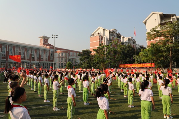 為慶祝中華人民共和國成立70周年,激發(fā)師生奮進(jìn)新時代的豪情壯志。9月30日早上,開發(fā)區(qū)香暉園小學(xué)在操場舉行隆重而盛大的“禮贊新中國 奮進(jìn)新時代”慶?;顒?,向祖國獻(xiàn)禮。全校師生2100余人參加了活動。