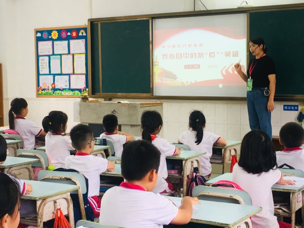 此次主題班會(huì)活動(dòng)在各班老師的有序組織下進(jìn)行。教室里,孩子們身著禮服,佩戴鮮艷紅領(lǐng)巾,坐姿端正,認(rèn)真聆聽臺(tái)上同學(xué)分享他們心中的抗“疫”英雄故事。“我一直在尋找一個(gè)英雄的榜樣……” “當(dāng)疫情暴發(fā)時(shí),他又義無反顧地去了武漢……”聽到一個(gè)個(gè)感人的故事,教室里一次次響起了熱烈的掌聲!英雄們的故事,將像春天的種子,在每個(gè)同學(xué)的心里都種下了一顆英雄夢,而這些掌聲,代表了孩子們對英雄們崇高的敬仰與欽佩!能在疫情面前挺身而出的人,有科學(xué)家、有醫(yī)生、有快遞員、有保安等各行各業(yè)的人,他們是身邊人,他們是普通人,而他們就是英雄,他們就是我們學(xué)習(xí)的榜樣!