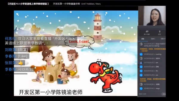 此次四校聯(lián)盟研討中,除了四校的英語(yǔ)教師、英語(yǔ)科組長(zhǎng)和區(qū)英語(yǔ)中心教研組組長(zhǎng)參加外,還邀請(qǐng)了開(kāi)發(fā)區(qū)第一小學(xué)蔡長(zhǎng)青副校長(zhǎng)、開(kāi)發(fā)區(qū)第一小學(xué)李春雨副主任及其他兄弟學(xué)校的部分英語(yǔ)教師一同參加了研討。活動(dòng)首先通過(guò)線上同課異構(gòu)的教學(xué)形式,分享了聯(lián)盟學(xué)校過(guò)去兩個(gè)月英語(yǔ)線上教學(xué)的情況;主要由開(kāi)發(fā)區(qū)第一小學(xué)陳鏡渝老師和第四小學(xué)孫意云老師進(jìn)行線上直播教學(xué),她們以不同的教學(xué)形式展示了四年級(jí)下冊(cè)“Unit7 Hobbies(Story)”的教學(xué)。她們?cè)谑谡n過(guò)程中,利用釘釘平臺(tái)的連麥、語(yǔ)音、互動(dòng)面板等功能,營(yíng)造活躍互動(dòng)的課堂氛圍。