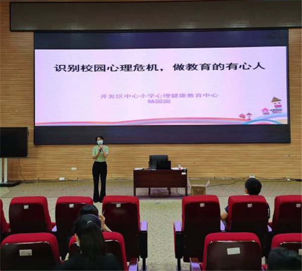 在疫情特殊時期,為全面保障校園安全,提高全體教師識別及應對校園心理危機的能力,學校專職心理老師楊圓圓在全體教職工工作會議上開展《識別校園心理危機,做教育的有心人》的專題培訓。