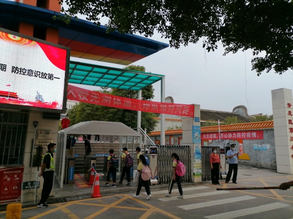 三小按照上級要求全力做好疫情防控和返校復(fù)課各項工作,精心策劃、科學(xué)安排、周密組織學(xué)生和教職員工返校。當(dāng)天早上6點多,三小校門口負(fù)責(zé)檢測和維持現(xiàn)場秩序的老師、工作人員已經(jīng)到崗做準(zhǔn)備。7點15分至45分,學(xué)生按照學(xué)校安排,錯峰排隊進入校園。每名同學(xué)都自覺佩戴了口罩,每個人之間隔了一米以上,沒有三三兩兩聚在一起的現(xiàn)象。老師們則來回巡視,提醒同學(xué)們不要隨意摘口罩、相隔遠一點。
