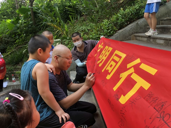 活動當(dāng)天,第五小學(xué)親子義工隊的志愿者們頂著高溫,早早來到了活動現(xiàn)場?;顒右潦?,親子義工隊負(fù)責(zé)人阮結(jié)連老師就本次活動的意義、活動安排、活動注意事項等事宜進(jìn)行講解,對小隊員們進(jìn)行創(chuàng)文知識的宣傳培訓(xùn)。準(zhǔn)備工作就緒后,親子義工隊的小隊員們在爸爸媽媽的帶領(lǐng)下對公園內(nèi)的群眾開展創(chuàng)文宣傳、普及文明創(chuàng)建知識,旨在提高市民群眾對創(chuàng)文的參與率、知曉率。雖然親子義工隊的隊員們年紀(jì)小小,但卻表現(xiàn)出創(chuàng)文小主人翁的意識,主動向群眾普及創(chuàng)文知識。群眾自覺在橫幅上簽署名字,承諾做文明的火炬人,為創(chuàng)建文明城市出一份力量。在宣傳活動的同時,成員們還“小手拉大手”對公園內(nèi)外衛(wèi)生死角進(jìn)行垃圾清除。雖然天氣炎熱,卻絲毫沒有阻擋第五小學(xué)親子隊成員們的熱情,他們身體力行積極參與創(chuàng)文工作,建設(shè)美麗火炬區(qū)。