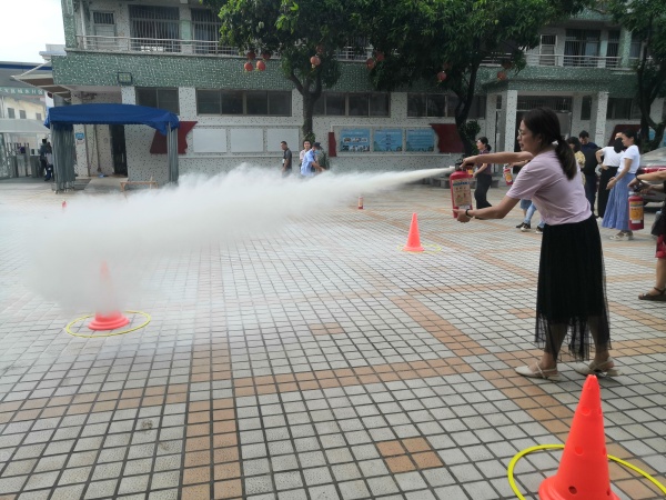 培訓(xùn)伊始,學(xué)校安全專干吳計(jì)亮老師結(jié)合學(xué)校消防工作的實(shí)際情況,和老師們講解了校園學(xué)習(xí)生活中如何防火、發(fā)生火災(zāi)后如何報(bào)警、如何自救逃生和如何使用消防器材等與日常生活密切相關(guān)的各類消防知識(shí)。隨后,全體教師集中校門口空地,吳老師給全體教職工講解干粉滅火器的使用技巧以及如何利用滅火器、撲滅火源的知識(shí),并分成若干小組用滅火器進(jìn)行實(shí)踐演練。