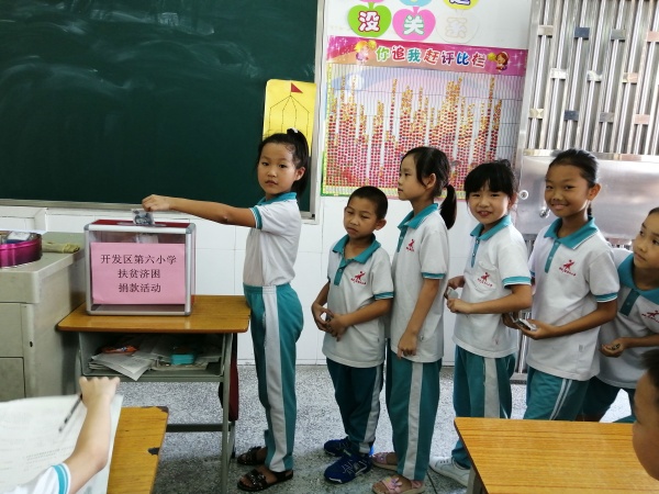 “贈人玫瑰,手留余香”,每年的6月30日是廣東省的扶貧濟(jì)困日,為了弘揚(yáng)中華民族傳統(tǒng)美德,積極踐行社會主義核心價值觀,開發(fā)區(qū)第六小學(xué)響應(yīng)省捐款活動的號召,于6月28日開展“學(xué)子獻(xiàn)愛心”捐獻(xiàn)活動,號召全體學(xué)生伸出援手,為弱勢群體捐款獻(xiàn)愛心。首先各班班主任在班級進(jìn)行愛心教育,講述本次愛心捐款的意義,動員全體學(xué)生積極行動起來,為貧困人員獻(xiàn)出自己的愛心。