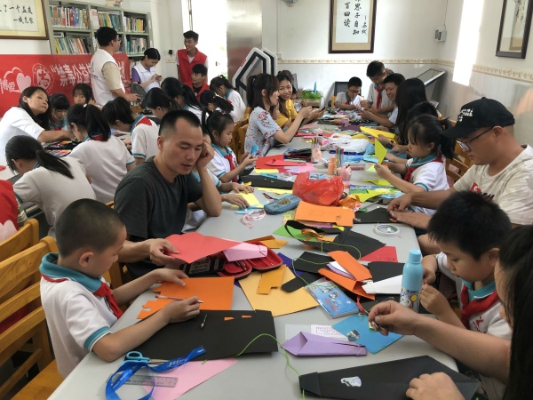 接著爸爸們和孩子們開始進行折領帶活動。爸爸和孩子動手擺弄著各種色彩鮮艷的卡紙,時而切切,時而雕雕,時而擺擺,剪裁出以“父愛”為主題領帶。最后由學校大隊輔導員羅征老師擔任評委,評選出最佳動手獎、最佳成果獎及最佳創(chuàng)意獎并給予頒獎。