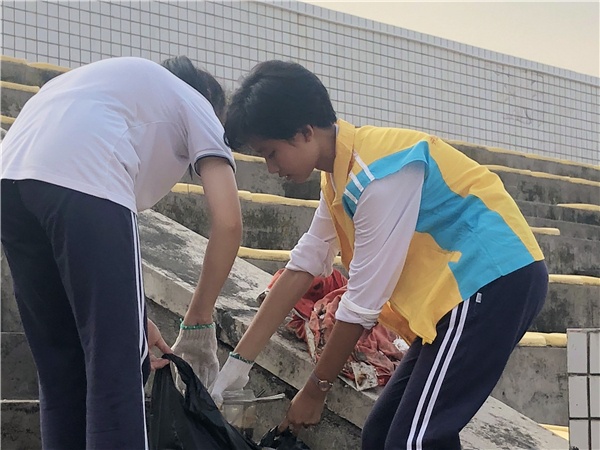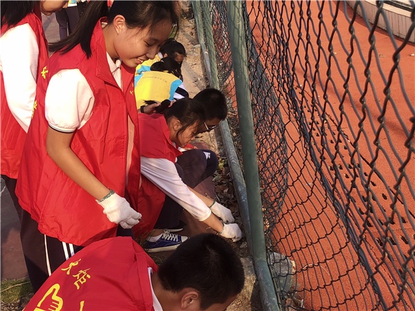開發(fā)區(qū)一中志愿者服務(wù)隊的同學(xué)們利用周末的時間,在胡筱鴻副校長的帶領(lǐng)下,與健康花城社區(qū)的工作人員一起進(jìn)行了衛(wèi)生清理工作。黨員教師黃輝梅則帶著學(xué)生志愿者,從開發(fā)區(qū)一中北門出發(fā),撿拾學(xué)?;@球場、塑膠跑道、足球場及看臺上的垃圾。教師黨員志愿者們則兵分兩路,分別從正、西門出發(fā),沿著學(xué)校圍墻外側(cè)人行道,清理沿途墻角和綠化帶里的碎紙、膠袋、包裝盒、舊瓶子等雜物。他們不放過一處死角,清理掉沿途的垃圾。路過的群眾、鍛煉身體的人們、社區(qū)的業(yè)主紛紛為他們的行動點(diǎn)贊。