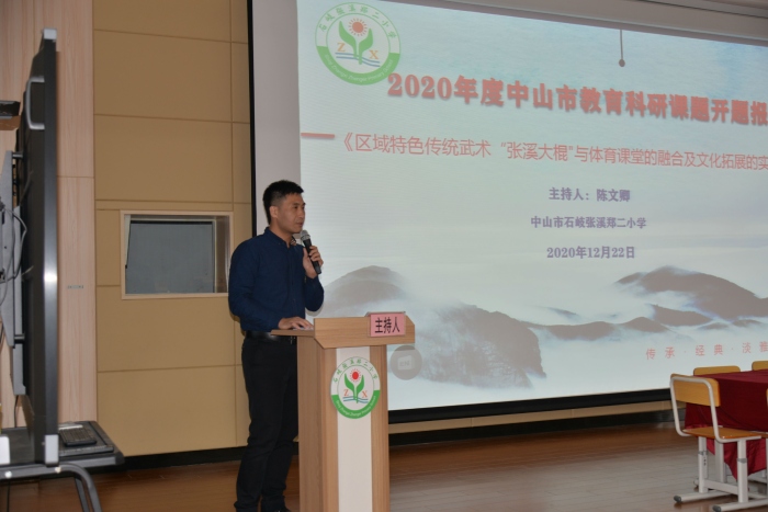 隨后,主持人陳文卿主任就課題《區(qū)域特色傳統(tǒng)武術“張溪大棍"與體育課堂的融合及文化拓展的實踐與研究》進行開題報告,主要是從選題依據(jù)、研究構架、思路方法、條件保障、創(chuàng)新之處、預期成果等六個方面進行了詳細的闡述,凸顯了課題與時俱進的價值、育人意義和創(chuàng)新思維。陳主任全面細致的闡述清晰勾勒出課題設計與實施的藍圖,贏得與會人員熱烈的掌聲。