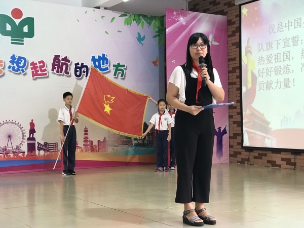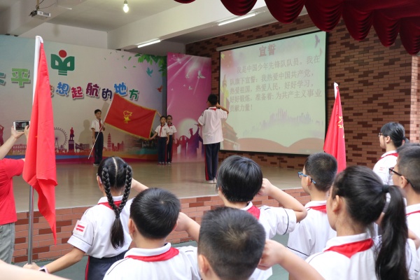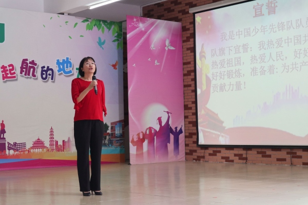 緊接著,余鳳華老師在隊(duì)旗下做了關(guān)于今年70周年國(guó)慶閱兵的講話,讓少先隊(duì)員理解閱兵、群眾游行活動(dòng)中展現(xiàn)的場(chǎng)景、蘊(yùn)含的寓意,實(shí)現(xiàn)中國(guó)夢(mèng)的美好未來,教育少先隊(duì)員記住和理解習(xí)爺爺對(duì)少先隊(duì)員的期望和囑托。然后,鄭結(jié)霞校長(zhǎng)深情寄語全體少先隊(duì)員,勉勵(lì)他們自立、自信、自強(qiáng),努力爭(zhēng)當(dāng)新時(shí)代好隊(duì)員。