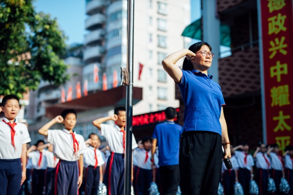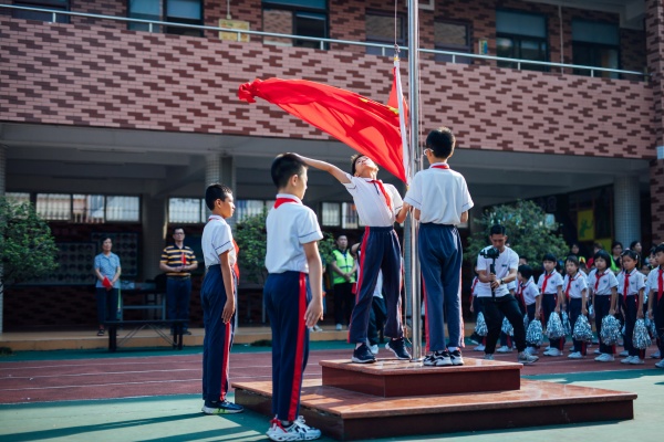 雄壯的愛(ài)國(guó)歌曲剛結(jié)束,低、中、高三個(gè)年段的愛(ài)國(guó)詩(shī)詞集體朗誦便一波接一波的涌來(lái),太平小腳丫的赤子愛(ài)國(guó)之情在澎湃的朗誦聲中表達(dá)的淋漓盡致。緊接著就是莊嚴(yán)的升旗儀式,四位佩戴著鮮艷紅領(lǐng)巾的升旗手在莊嚴(yán)的國(guó)歌聲中將五星紅旗徐徐升起,全體教師行注目禮,少先隊(duì)員行隊(duì)禮,在金秋朝陽(yáng)的照耀下,五星紅旗顯得更加的驕艷、溫暖與厚重。
