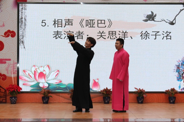 緊接著,中山市文學藝術(shù)界聯(lián)合會和中山市戲劇家協(xié)會帶來了原創(chuàng)戲劇曲藝作品巡演。《我是歌王》、《掉的就是這個孩》、《啞巴》等5個相聲,引得全校師生捧腹大笑、連連喝彩。
