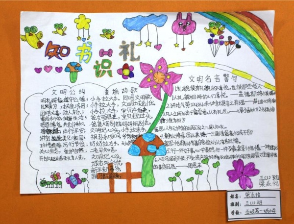 9月24日,第一城小學(xué)在校內(nèi)宣傳欄展示了“文明公約”親子手抄報和主題美術(shù)作品。這些優(yōu)秀作品是九月份向全校同學(xué)征集,從各班評比上送的五份作品中精選而來。作品以圖文、漫畫等形式表現(xiàn)了學(xué)生和家長們對中山市民文明公約、文明城市創(chuàng)建、文明校園創(chuàng)建的理解。