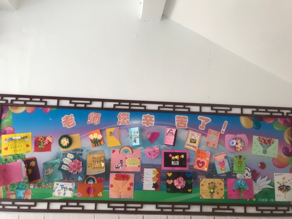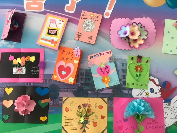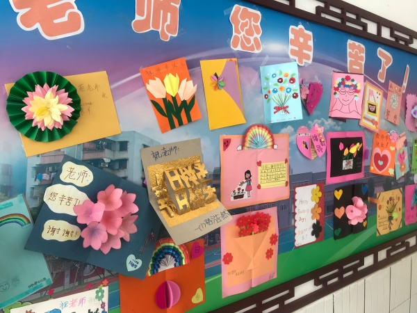 今天,校園里德育處的宣傳欄格外引人注目。上面貼滿了孩子們親手為老師制作的賀卡。精致的紙花,稚嫩的筆跡,賀卡的樣式不盡相同,卻都洋溢著對恩師真摯的問候。