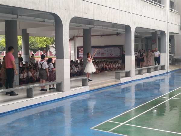 第一項(xiàng),首先由洪杰琳演唱悅耳動(dòng)聽(tīng)的《我和我的祖國(guó)》,接著在兩位小主持甜美高亢的聲音中以及莊嚴(yán)的國(guó)歌聲中拉來(lái)開(kāi)了序幕,師生們懷著崇高的敬意高高舉起右手,寄托著自己對(duì)石岐第一城小學(xué)未來(lái)的美好憧憬與祝愿。