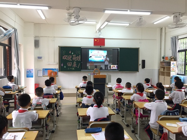 回歸班級(jí),學(xué)生在正副班主任的歡迎聲中走進(jìn)了久違的教室,見到了多日未見的同學(xué)們。第一節(jié)班隊(duì)會(huì)課,吳嬋娟主任組織學(xué)生在教室舉行升旗儀式,同學(xué)們整齊佩戴紅領(lǐng)巾,唱國(guó)歌,向五星紅旗行隊(duì)禮。學(xué)生個(gè)個(gè)高聲唱起國(guó)歌,眼神堅(jiān)定,精神飽滿,用最好的狀態(tài)迎接“開學(xué)第一課”。緊接著,黃榮勝校長(zhǎng)進(jìn)行開學(xué)致辭,題為”健康校園,從我做起”。黃榮勝校長(zhǎng)通過(guò)以下幾點(diǎn)進(jìn)行介紹:一、介紹新型冠狀病毒肺炎的相關(guān)常識(shí);二、教導(dǎo)孩子正確的洗手方法;三、為同學(xué)們提供校園防控方法并做了詳細(xì)說(shuō)明。四、寄語(yǔ)新學(xué)期。最后,由各班班主任對(duì)線上學(xué)習(xí)進(jìn)行小結(jié),了解關(guān)心學(xué)生的學(xué)習(xí)生活,并帶領(lǐng)學(xué)生學(xué)習(xí)一日常規(guī),保證學(xué)生能夠更快適應(yīng)校園生活,更好投入到班級(jí)學(xué)習(xí)中來(lái)。