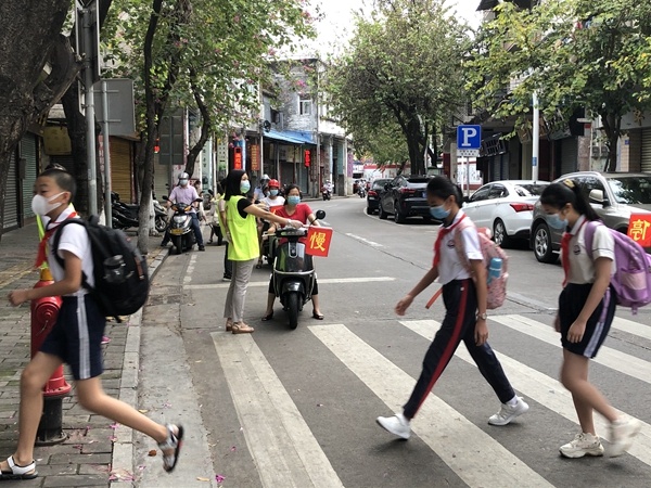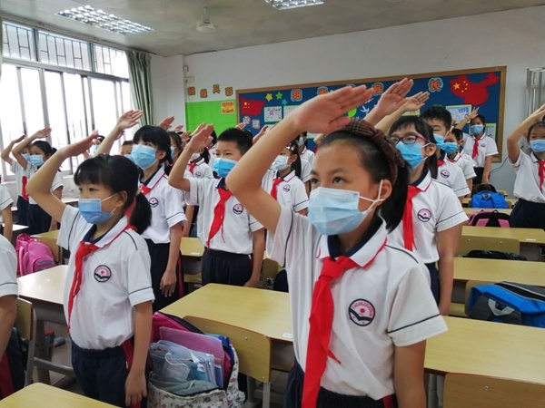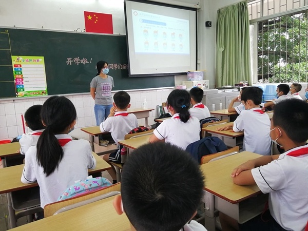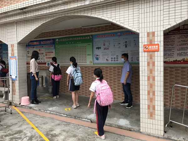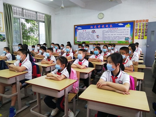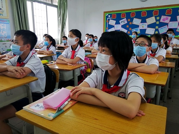 18日清晨,在黃榮勝校長帶領下,全體行政、四至六年級的教師以及校工等都各司其職,站在自己的崗位上迎接“返校”學生。同學們都佩戴口罩,間隔一米列隊通過閘機,體溫正常后,有序地進入熟悉的校園。