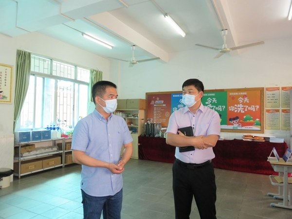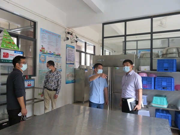 學(xué)校黃榮勝校長先匯報(bào)了復(fù)學(xué)返校的工作,學(xué)校按照“中山市中小學(xué)校幼兒園學(xué)生返校準(zhǔn)備工作驗(yàn)收表(第一版)”要求,健全學(xué)校疫情防控體系、制訂兩個(gè)方案、建立傳染病防控九項(xiàng)制度、場室管理、人員進(jìn)出管理、疫情防控物資等工作進(jìn)行匯報(bào)。在聽取匯報(bào)的過程中,李杰平副主任仔細(xì)查看測溫點(diǎn)設(shè)置等候區(qū)的距離,學(xué)生課桌椅擺放的情況,煙墩校區(qū)廚房的衛(wèi)生等。通過實(shí)地考察和聽取匯報(bào),李杰平副主任充分肯定學(xué)校有序做好復(fù)學(xué)返校的各項(xiàng)工作,并提出建議,要多跟區(qū)疾控中心聯(lián)系,研讀防疫工作的各項(xiàng)要求,密切關(guān)注中山市第一批返校復(fù)學(xué)的情況,多汲取別人的工作經(jīng)驗(yàn),特別提出由于學(xué)校是一校兩區(qū)的管理,部分老師要跨校區(qū)教學(xué),要合理制定預(yù)案,避免或減少兩校區(qū)人員的流動。