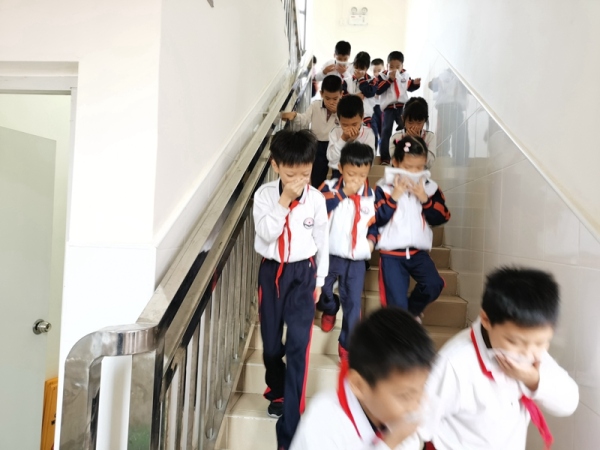 上午8點(diǎn)15分,警報(bào)拉響,演練開始。各班學(xué)生迅速有序出班,用準(zhǔn)備好的濕毛巾捂住口鼻,彎腰前行,按照各自逃生路線向安全區(qū)域疏散。正副班主任維持秩序、應(yīng)急疏導(dǎo),各樓梯及小道上的老師從旁指揮引導(dǎo)。學(xué)生們聽從指揮、行動迅捷,沒有驚慌失措的喊叫,也沒有一人摔倒。各個樓層負(fù)責(zé)任的老師進(jìn)行最后確認(rèn),保證沒有一個學(xué)生滯留。整個過程做到了快速、安全、有序。