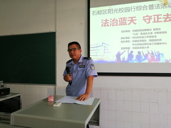 為進(jìn)一步加強(qiáng)禁毒教育工作,提高廣大師生對(duì)毒品危害性的認(rèn)識(shí),促進(jìn)學(xué)生健康安全成長(zhǎng),9月11日下午,石岐高家基小學(xué)開(kāi)展了“法治藍(lán)天、守正去邪”陽(yáng)光校園綜合普法活動(dòng)。此次活動(dòng)由石岐區(qū)綜治維穩(wěn)辦、文體教育局等單位聯(lián)合主辦,由中山市社會(huì)工作者協(xié)會(huì)承辦,特邀煙墩派出所陳遠(yuǎn)華副所長(zhǎng)擔(dān)任主講嘉賓。