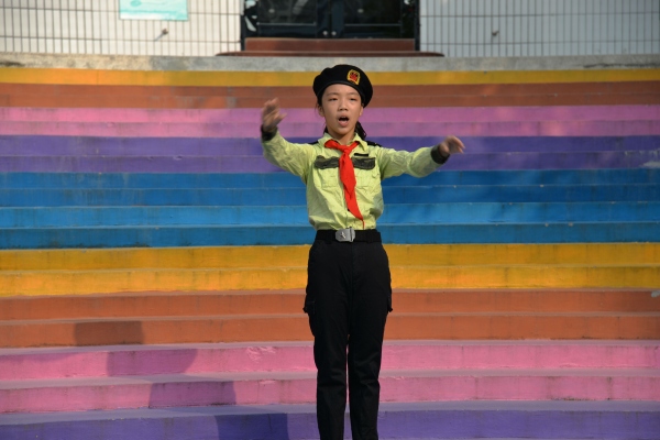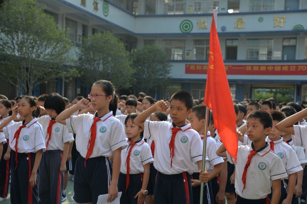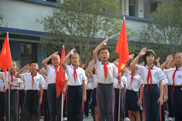 早晨8點,石岐張溪鄭二小學全體師生在激昂的運動員進行曲下整齊有序地來到操場。全校教師佩戴著鮮艷的紅領巾在升旗臺前面排成整齊的隊伍。一切準備就緒,升旗手們邁著莊嚴而整齊的步伐走到旗臺下?!吧龂欤喑獓?,敬禮!”全體師生莊重地注視著冉冉升起的國旗,表達著對國旗的無限敬意。隨著雄壯高昂的旋律響起,隊員們高唱隊歌,用嘹亮的歌聲表達著對紅領巾的熱愛,隊員們激情昂揚,朝氣蓬勃。隊旗高高飄揚,星星火炬閃耀著金光,隊鼓鏗鏘而嘹亮,召喚著伙伴響徹四方。隨后,五(2)中隊同學帶來國旗下講話《中國的生日》,稚嫩的聲音承載著深情的祝福。接著,大隊輔導員周銳鵬老師帶領大家重溫入隊誓詞,在隊旗下莊嚴宣誓。六(2)中隊同學帶來詩歌朗誦《我是光榮的少先隊員》,“隊旗飄飄,歌聲嘹亮,我們的心在激蕩,我們的情在流淌,每一塊紅領巾都是用鮮血染成,每一位少先隊員都能沐浴到黨的陽光”,讓同學們感受到作為少先隊員的光榮和自豪?;顒幼詈?,大隊輔導員周老師帶領隊員呼號:“準備著,為共產主義事業(yè)而奮斗!”全體隊員高聲回應著:“時刻準備著!”映襯著紅領巾的光輝,每個孩子都精神抖擻,洋溢著自豪的笑容。