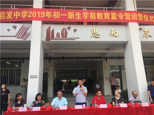 2019年8月29日下午,啟發(fā)中學初一新生學前教育夏令營閉營儀式正式拉開帷幕。參加本次閉營儀式的領導和嘉賓有:啟發(fā)中學校長謝永芳、城區(qū)消防中隊隊長蔡洋、啟發(fā)中學副校長祝玉珍、啟發(fā)中學副校長林容森、啟發(fā)中學教務處主任鄧小斐、啟發(fā)中學德育處副主任馬健媛;學校全體行政、全體教官、班主任和初一年級全體新生;部分新生家長也積極參加了本次閉營儀式。