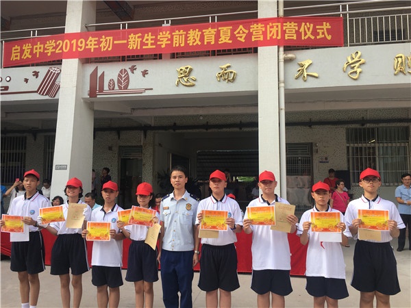 隨后匯操比賽頒布了各項獎項,分別頒發(fā)了優(yōu)秀教官“榮譽證書”及紀念品、匯操比賽獎、最佳指揮員獎、優(yōu)秀學員獎,由現場領導和嘉賓為獲獎教官和學生頒獎。頒獎完畢,啟發(fā)中學校長謝永芳作新生學前教育夏令營總結講話。最后由城區(qū)消防中隊隊長蔡洋宣布:啟發(fā)中學2019年初一新生學前教育夏令營圓滿成功,閉營!