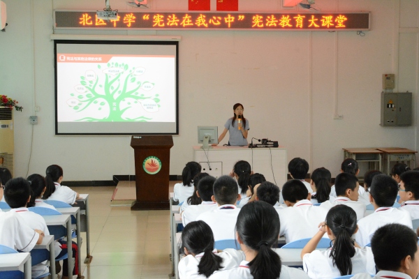 “憲法教育大課堂”是由省普法辦、省司法廳、省教育廳、團省委、省律協(xié),根據(jù)中央和省關于開展憲法宣傳教育和貫徹實施的重要部署,圍繞“尊崇憲法、學習憲法、遵守憲法、維護憲法、運用憲法”,組織開展面向青少年學生的憲法學習宣傳教育活動。北區(qū)中學舉行“憲法在我心中”教育大講堂活動,讓學生學法、知法、懂法、守法,努力成為一名遵紀守法的好公民。