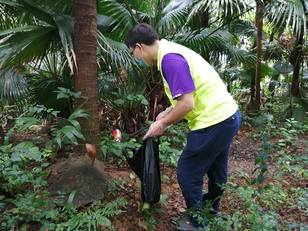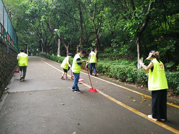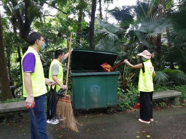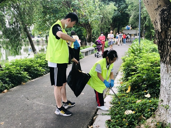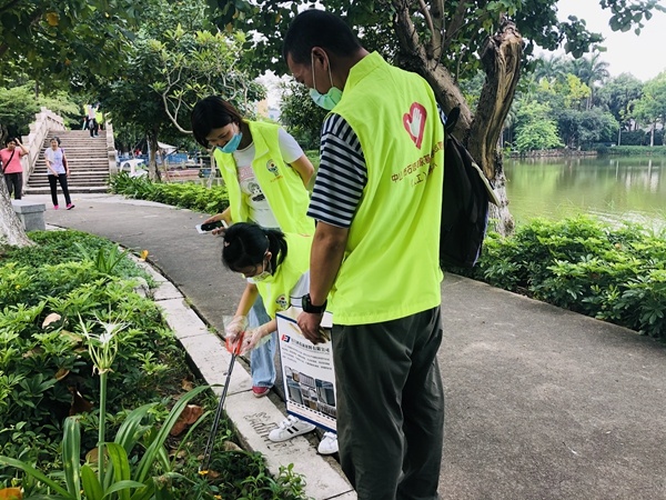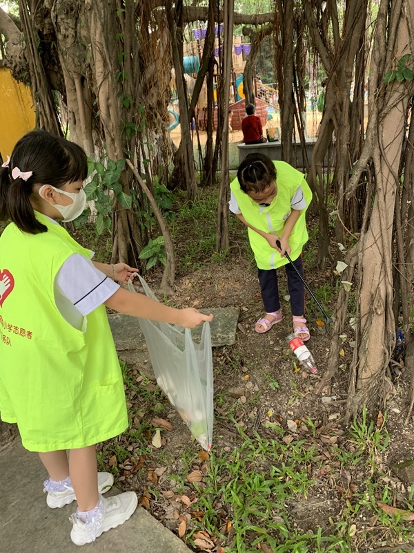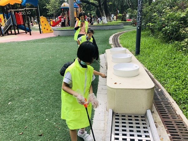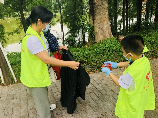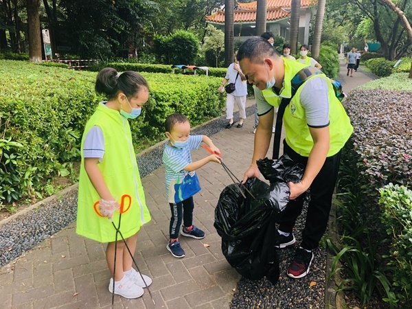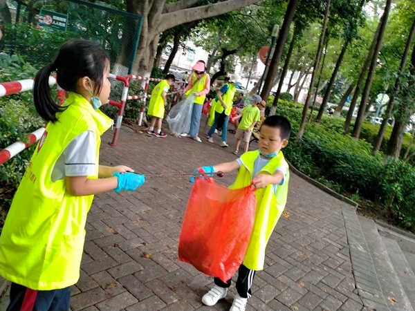 上午9點,志愿者服務隊在各隊長的帶領下,兵分三路:第一服務隊由一(3)班師生、家長組成,主要任務消毒課室;第二服務隊在黃榮勝校長的帶領下,由黨員、教師組成,主要清理煙墩山;第三服務隊在一(2)班師生、家長的支持下,主要消除逸仙湖公園垃圾死角。黃玉媛老師率領了一支綠色小隊“向逸仙湖公園“出發(fā)”,有的帶著藍色手套,有的拿著白色的塑料袋,還有的手拿鉗子,戴手套的同學撿垃圾,拿塑料袋的家長收垃圾,就這樣,大家配合的十分默契。不管年紀大小,父母和小義工們都很認真,醒目養(yǎng)眼的義工服成了逸仙湖里一道亮麗的風景線。大路上垃圾不多,于是大家鉆到花圃里發(fā)現(xiàn)了大量的垃圾。有游客丟棄的煙頭、紙巾、果皮、瓜子、食品袋等各種生活垃圾,家長們都說沒想到有這么多垃圾,袋子都快裝不下了。一個多小時后,草坪上、過道上的垃圾就被檢光了。大家陸陸續(xù)續(xù)回到集合點,垃圾都裝滿了袋子,大人和孩子們都走得滿頭大汗,雖然累,心里卻是開心的,我們用行動傳播環(huán)保理念,為逸仙湖公園增添了亮麗的色彩,為逸仙湖公園的美好環(huán)境貢獻了一份力量。