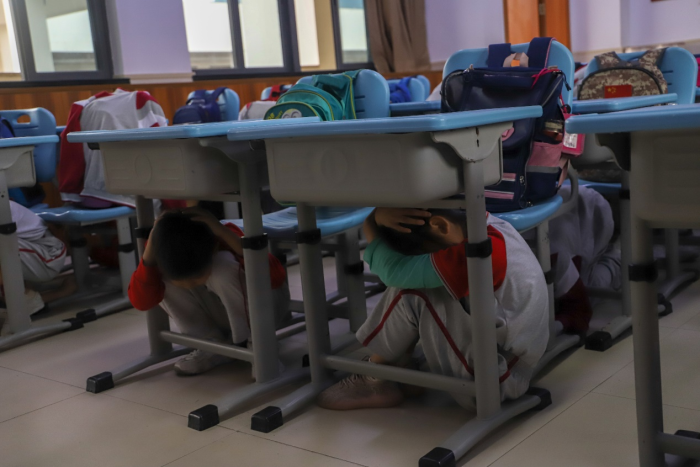 演練前,學(xué)校安全科結(jié)合實際情況,成立防震減災(zāi)演練工作指揮組,指揮組完善疏散演練方案,部署演練工作,明確疏散演練集合地點(diǎn)、疏散順序和注意事項;各班召開防震自救專題班會,讓學(xué)生了解應(yīng)急避震知識、熟悉逃生路線。演練開始后,各班老師們迅速到崗,當(dāng)聽到發(fā)生地震的警報時,同學(xué)們迅速雙手抱頭,躲避在課桌下緊急避險,在老師的組織下,有序進(jìn)行撤離,用最短的時間,從教學(xué)樓上安全撤離到了指定地點(diǎn)。