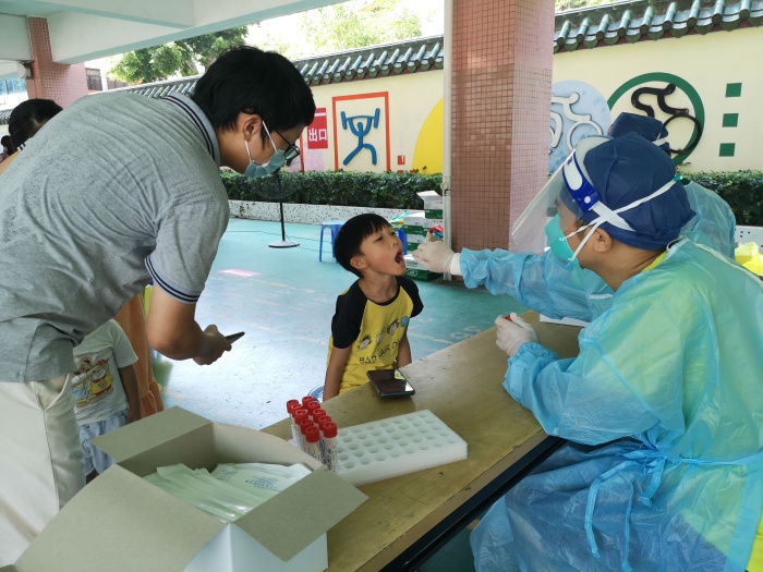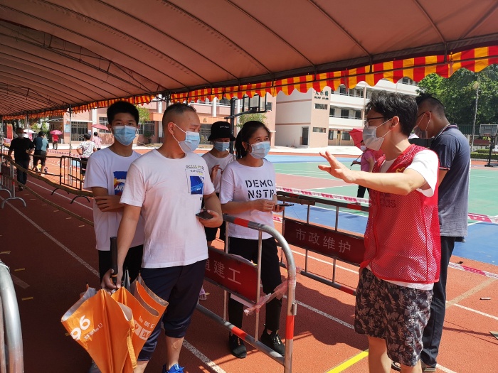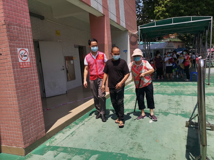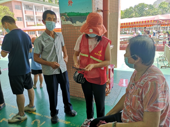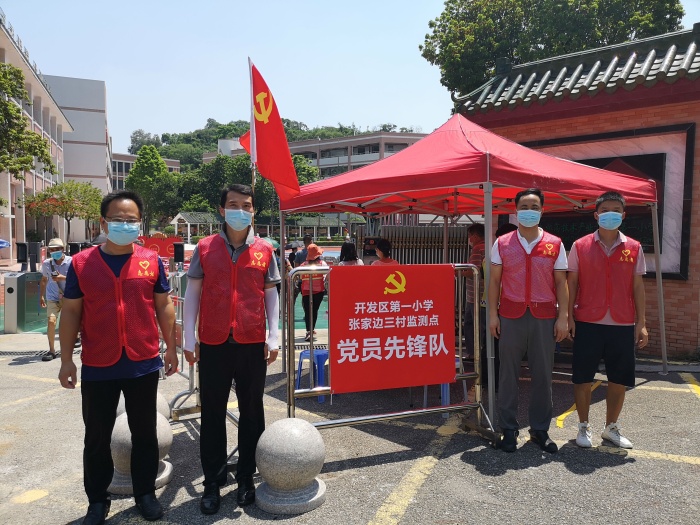 7月23日早點8點,開發(fā)區(qū)第一小學張家邊三村核酸檢測點開始檢測,開發(fā)區(qū)醫(yī)院10人和南方醫(yī)科大學南方醫(yī)院5人共同組成了此次開發(fā)區(qū)一小檢測點檢測團隊。學校和村委為老人和兒童開設(shè)了綠色通道,方便了特殊人員的核酸檢測。在核酸檢測點,開發(fā)區(qū)第一小學黨支部的黨員志愿者引導(dǎo)群眾有序排隊入場,查驗粵康碼、核酸碼,為老人及兒童填寫核酸碼信息,照顧年紀大的老人,指揮群眾有序離場?!澳鷦e急,我來幫你做”是回蕩在現(xiàn)場最多的話語,“汗流浹背”是現(xiàn)場工作人員的真實寫照。開發(fā)區(qū)第一小學張家邊三村檢測點預(yù)計今天要完成7200余份核酸采樣,截止中午12:00已完成3100余份采樣。