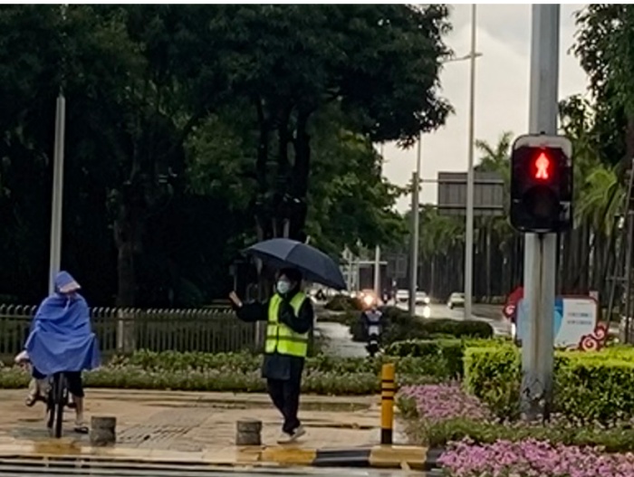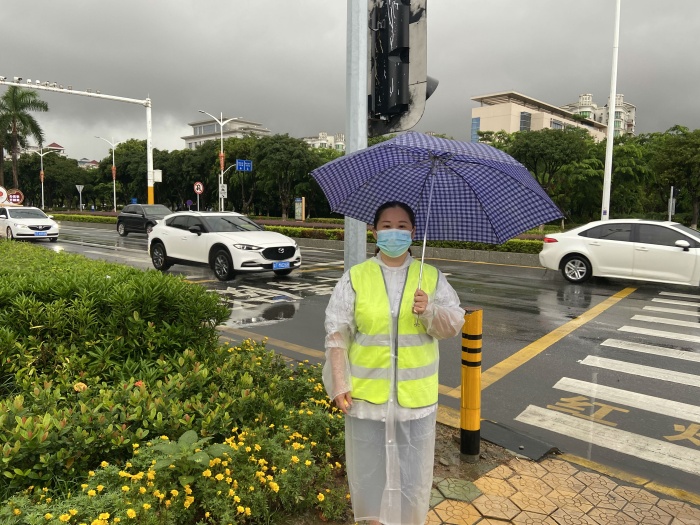 早上7點(diǎn)20分,開發(fā)區(qū)第一小學(xué)的教師志愿者們就來到世紀(jì)一路十字路口,教師志愿者穿著統(tǒng)一的志愿者服,佩戴口罩,盡管受臺(tái)風(fēng)“查帕卡”的影響,仍阻止不了教師志愿者的行動(dòng),她們冒雨堅(jiān)守崗位,與交警們一起在各個(gè)主要路口,指揮著出行的市民安全有序的過馬路。在勸導(dǎo)過程中,非機(jī)動(dòng)車不按車道行駛、越過停止線、未佩戴頭盔、超載等不文明行為,在志愿者勸導(dǎo)下路口漸漸整齊有序。她們還為行人做指引,保證行人能安全過馬路。