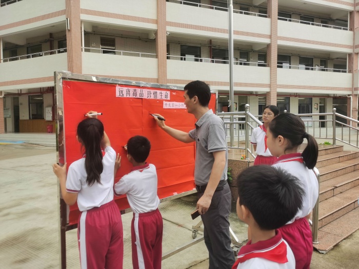 隨后,學校的大隊長葛嘉萱宣讀了禁毒倡議書,并帶領(lǐng)全體師生在國旗下慷慨激昂地許下誓言:“遠離毒品,珍愛生命,與毒品作堅決斗爭!從我做起,以抵制毒品為榮,以吸毒販毒為恥,牢記歷史使命,為中華民族的偉大復(fù)興而奮斗!” 宣誓后師生將自己的名字一筆一劃地寫在了簽名橫幅上,表達了自己珍愛生命、拒絕毒品的決心。