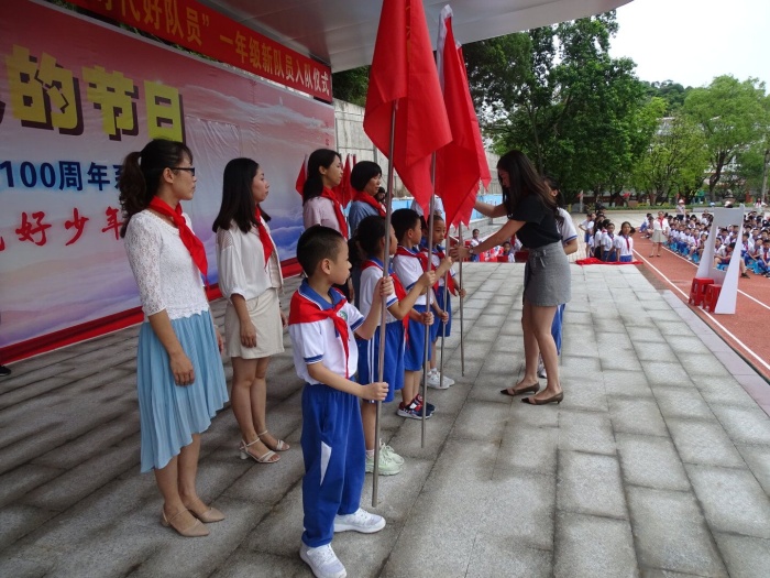 活動伊始,全體師生起立升國旗奏唱國歌,入隊儀式在激昂的《出旗曲》中拉開帷幕。全體同學(xué)共同唱響《中國少年先鋒隊隊歌》。大隊輔導(dǎo)員林慧老師宣讀了新隊員名單。少先隊員代表為同學(xué)們戴上了鮮艷的紅領(lǐng)巾,鮮艷的紅領(lǐng)巾佩戴在他們的胸前時,少先隊員們的臉上洋溢著激動與自豪。在少先隊大隊輔導(dǎo)員林慧老師的帶領(lǐng)下,少先隊員面向隊旗莊嚴(yán)宣誓:我是中國少年先鋒隊隊員,我在隊旗下宣誓:我熱愛中國共產(chǎn)黨,熱愛祖國,熱愛人民,好好學(xué)習(xí),好好鍛煉,準(zhǔn)備著:為共產(chǎn)主義事業(yè)貢獻(xiàn)力量!隨后,該校馮麗芬副校長授隊旗給中隊長,周瑞珍校長給中隊輔導(dǎo)員頒發(fā)聘書。