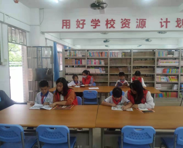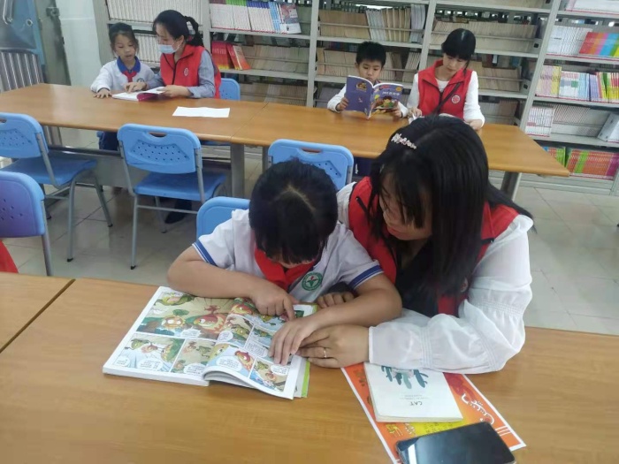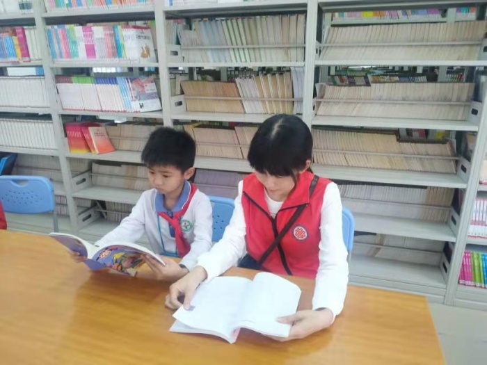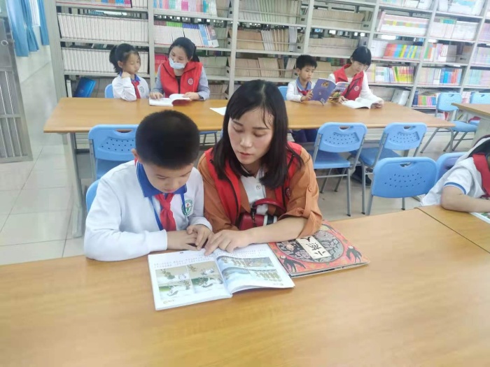 大手拉小手,小小的身影后面跟著一位笑容滿面的家長,兩人從容不迫地走進學(xué)校的圖書館。她們雙眼炯炯有神地盯著書架上整齊有序的書本,雙手輕撫書本,最后一人捧著一本自己喜愛的書安靜地坐下。一對對親子各自認真地閱讀,媽媽時不時向女兒介紹黨的成長之路,女兒時不時皺著眉頭輕聲向母親提問,兒子時不時給媽媽普及軍事知識。溫情又和諧的一幕,令人倍感美好。隨著時間的流逝,進入圖書館的學(xué)生與家長越來越多,然而現(xiàn)場并沒有因為人多而熱鬧,每一對親子都安靜地閱讀著手中的書本,輕聲交流心得。