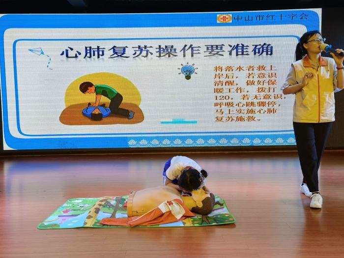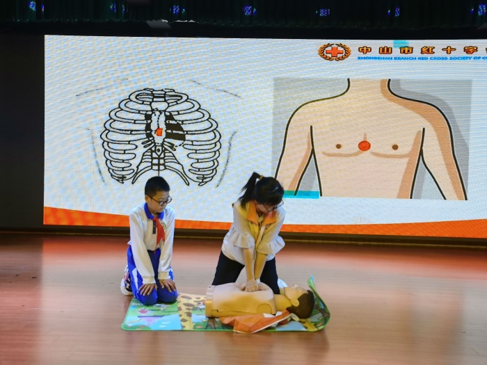 講座中,鄭老師語言生動易懂,配合詳細(xì)的PPT展示、問答互動和現(xiàn)場的模仿操作,現(xiàn)場氣氛十分活躍,學(xué)生們積極參與其中。她尤其重點講解了在實際救援中,如何抓住最有效的“黃金四分鐘”時間,開展心肺復(fù)蘇救援。鄭老師為了讓模擬更加逼真,她結(jié)合模型,親身給學(xué)生示范如何正確進(jìn)行心肺復(fù)蘇,告訴孩子們心肺復(fù)蘇的正確按壓部位和步驟,并邀請了學(xué)生上臺模擬。同學(xué)們興趣盎然,部分學(xué)生還上臺進(jìn)行了互動交流,贏得現(xiàn)場掌聲陣陣。講座的最后,鄭老師呼吁同學(xué)們重視生命安全,學(xué)會科學(xué)施救。會后中山市紅十字會還為同學(xué)們分發(fā)了紅十字會宣傳手冊。
