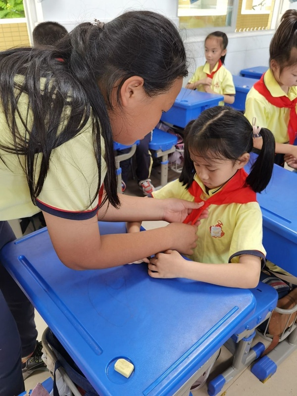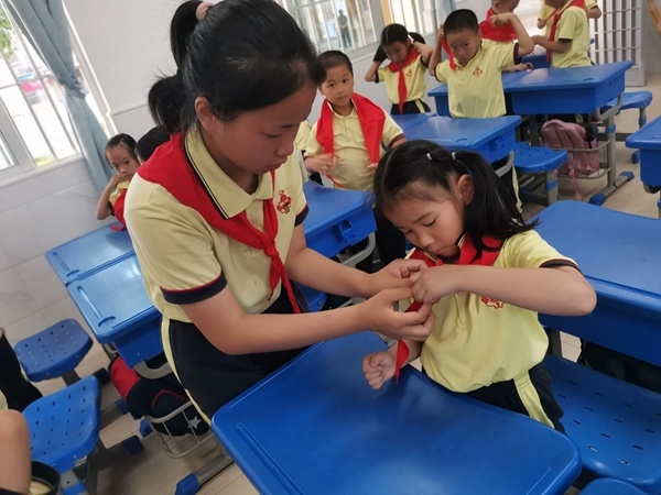 大隊(duì)委員們耐心地講解了中國少先隊(duì)組織機(jī)構(gòu)、發(fā)展過程和歷史貢獻(xiàn)。詳細(xì)講解了“六知六會(huì)一做”的知識(shí),并且手把手的一年級的弟弟妹妹們敬隊(duì)禮,佩戴紅領(lǐng)巾,學(xué)唱少年先鋒隊(duì)隊(duì)歌,如何宣誓和呼號等,一年級的小同學(xué)們聽的很認(rèn)真,每一雙小眼睛都散發(fā)出渴望成為一名少先隊(duì)員的光芒。