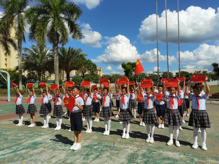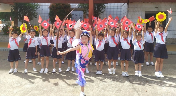 “今天是你的生日,我的中國……”“五星紅旗迎風(fēng)飄揚(yáng),勝利的歌聲多么響亮……”“道可道,非常道;名可名,非常名......”伴隨著悠揚(yáng)的旋律,同學(xué)們揮舞著國旗、黨旗,或歌或舞,或吟或誦,或書或畫,用不同形式抒發(fā)對祖國的美好祝福和對經(jīng)典詩文的無限熱愛?!绑A旅客逢梅子雨,池亭人挹藕花風(fēng)?!表嵚蓛?yōu)美的《笠翁對韻》,一組對詞就是一句念白,一副對子就是一段唱腔,妙不可言,同學(xué)們在誦讀中不知不覺掌握對仗用韻,學(xué)會遣詞造句,奠定了國學(xué)根基。朗朗上口的《三字經(jīng)》《千字文》《弟子規(guī)》節(jié)奏明快,更匯集古代圣賢思想,同學(xué)們在誦讀中傳承著少年養(yǎng)志、知書達(dá)理的中華文明。