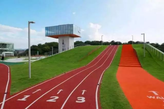 云棲小鎮(zhèn)會展中心二期是一個非典型的“會展中心”,因為它既是一個功能齊備的會展中心,閑時它又會變身成為一個“體育倉庫”,里頭有籃球、羽毛球、攀巖等各種場地,但最搶眼的則是會展中心屋頂上,橫亙著的那條760米長的環(huán)形塑膠跑道。這整條跑道和以往見過的任何一條操場跑道不同,有上下坡,有彎曲和分叉,也有直行沖刺道,建筑邊沿處還特別設計了一段50米長完全懸空的“凌空跑道”。