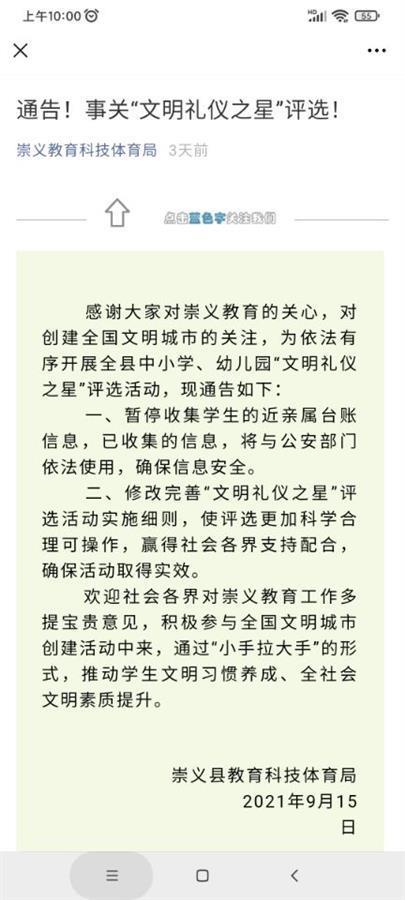 就在同一日,崇義縣教育科技體育局微信公眾號又發(fā)布了一條通告。通告稱,暫停收集學生的近親屬臺賬信息,已收集的信息,將與公安部門依法使用,確保信息安全;修改完善“文明禮儀之星”評選活動實施細則,使評選更加科學合理可操作。