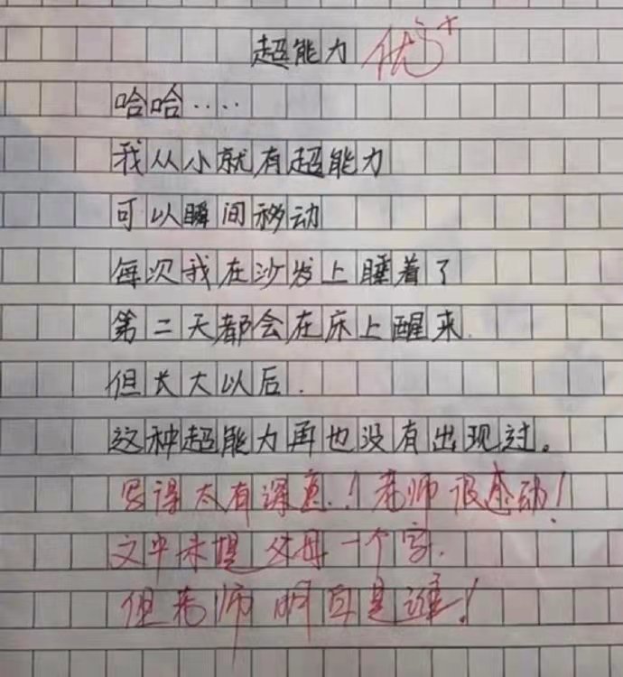 這篇文作文很短,題目是《超能力》,但是內(nèi)容卻在講述和家長對學生們滿滿的愛意。學生寫到我從小就有超能力,可以瞬間移動,每一次在沙發(fā)上睡覺,第二天都會在床上醒過來。