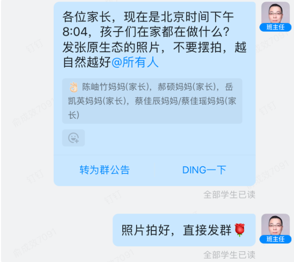 “現(xiàn)在是北京時(shí)間下午8:04,孩子們?cè)诩叶荚谧鍪裁矗?/strong>發(fā)張?jiān)鷳B(tài)的照片,不要擺拍,越自然越好”,同時(shí)@所有家長(zhǎng)。
