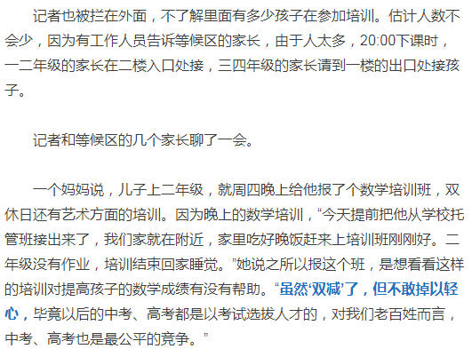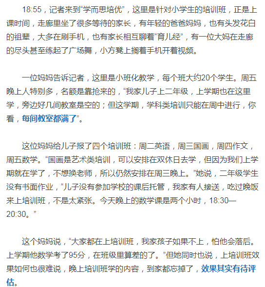 一位爸爸告訴記者,孩子上三年級了,“上的應(yīng)該是數(shù)學(xué)培訓(xùn)班吧”,他有點不太確定,說是孩子媽媽報的,“我只負(fù)責(zé)接送。17:30把孩子從學(xué)校接出來,18:30之前趕到這里培訓(xùn),晚飯吃得非常匆忙。接下來,要看看是否會適應(yīng)。”他說上學(xué)期孩子也在這里上培訓(xùn)班,報了兩門學(xué)科,是周六上午,學(xué)4個小時,“我把孩子送進(jìn)后,4個小時里還能干些自己的事”,如今“雙減”后,學(xué)科培訓(xùn)只能在周中的晚上,大約20:00下課,因為政策規(guī)定線下培訓(xùn)結(jié)束時間不晚于20:30,“從18:30到20:00,只有一個半小時,我也干不了什么,索性就在這里等,看看書?!?/p>