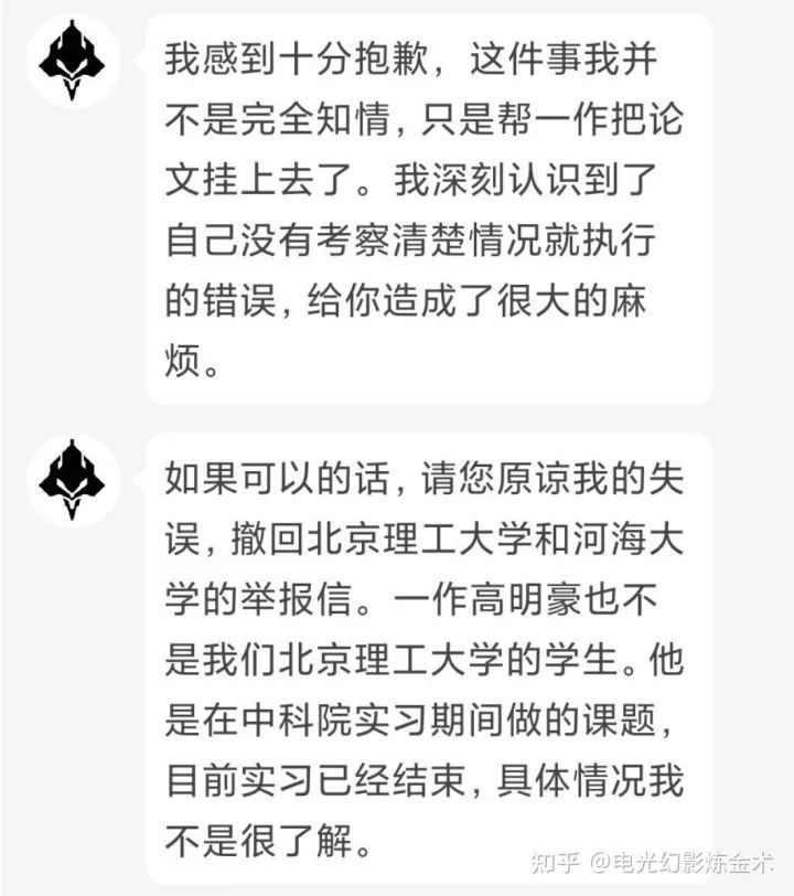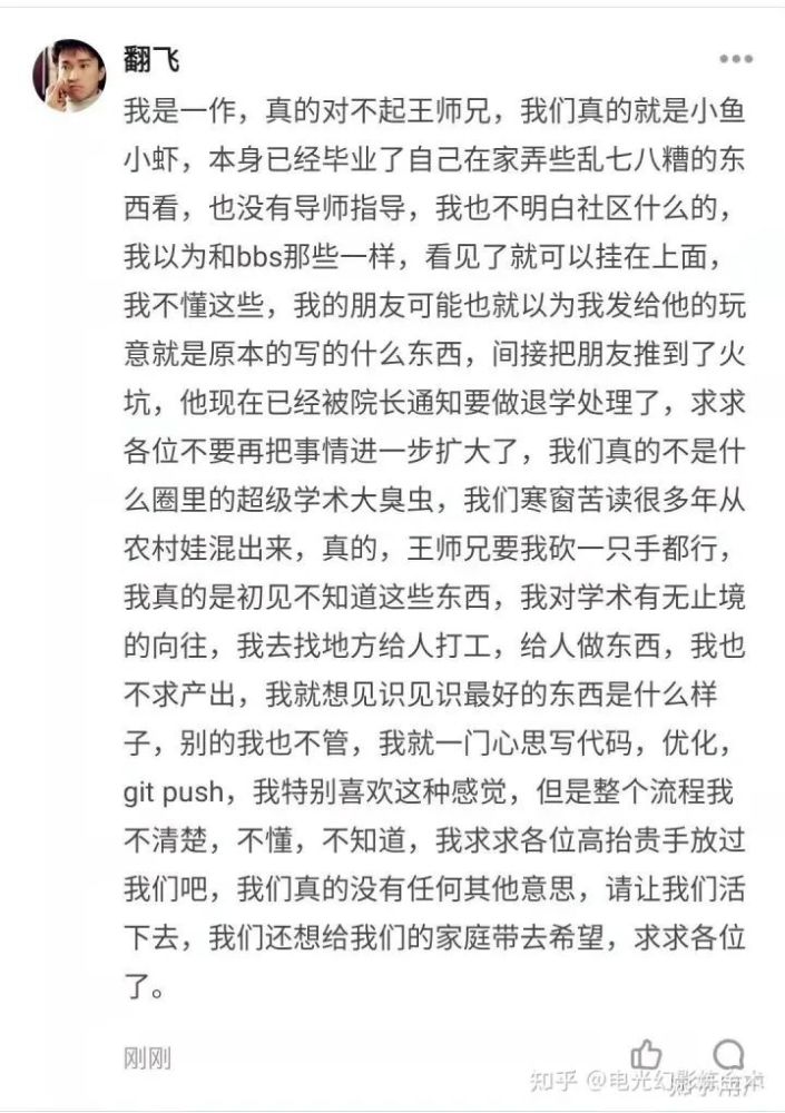 對于新手,如果說是一般性的錯誤甚至部分仿寫,都可以理解。但是全文照抄屬實說不過去,應(yīng)當(dāng)負有學(xué)術(shù)責(zé)任。何況這次是抄襲未發(fā)表未公開的文章??梢赃@么說,如果說王劍鋒沒有錘他的話,這篇文章的著作權(quán)將被他奪去,因為抄襲者是第一個公開的。這是非常惡劣的事件,研究者幾個月乃至幾年的工作,就被幾個小時的ctrl+c,ctrl+v奪取,傷害的不僅是王劍鋒本人,而且是其他認真做research的人的感情。抄襲者應(yīng)當(dāng)公開承認抄襲并道歉,而不是說“辦事不周“”不了解情況“”希望不要留下污點“。幸虧這次是抄襲到了知乎大V,有幾萬粉絲的王劍鋒,如果是抄襲的一般人,可能很難引起關(guān)注。