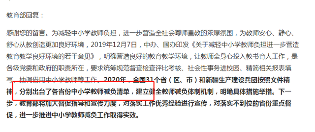 教師群體作為食物鏈最低端的存在不得不向教育部尋求幫助,畢竟憑借他們自己的力量真是難以抵抗,所以有人就在網(wǎng)絡上向教育部進行提問。并且教育部在收到提問的第一時間,回復。