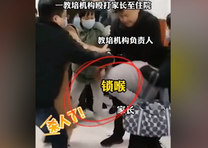 在一處教育機構(gòu)內(nèi),窗明幾凈,這明明是一處學(xué)習(xí)的場所,如今卻面目全非。教室內(nèi),幾名家長被一群機構(gòu)工作人員團團圍住,拳腳相加,一名年紀(jì)已經(jīng)不小的男性家長雖奮力反抗,但無奈對方人多,他被教育機構(gòu)的人死死卡住脖子,猛扇耳光,一名孕婦家長更是被教育機構(gòu)的人團團圍住踢打,場面十分混亂。