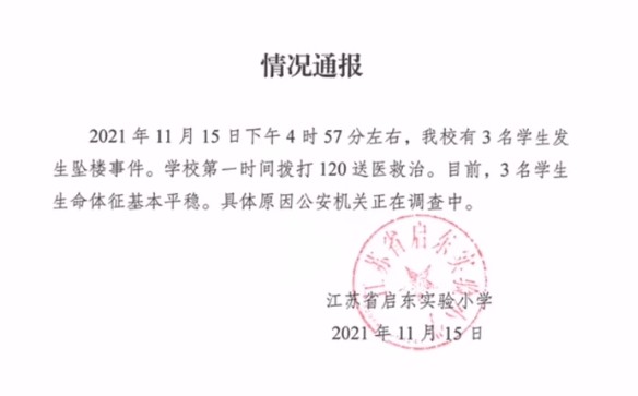 據(jù)媒體報道,11月15日下午4時57分許,位于江蘇省啟東市的一處小學(xué)教學(xué)樓內(nèi),三名女學(xué)生從5樓墜落,學(xué)校工作人員發(fā)現(xiàn)情況后,立刻撥打了120求助,在急救人員趕到現(xiàn)場后,對3名學(xué)生進行了救治。