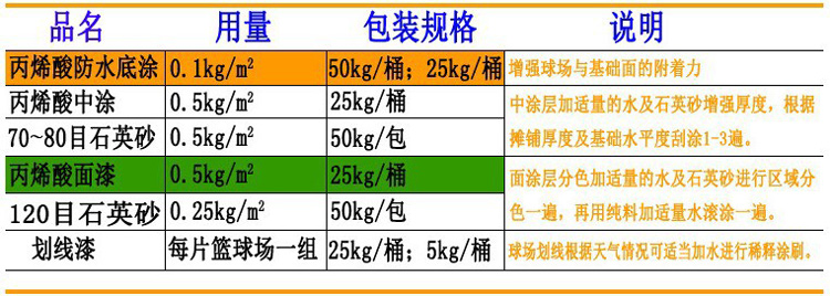 產(chǎn)品簡介:丙烯酸球場材料材料簡介:丙烯酸材料是可施工于混凝土基礎(chǔ)層與瀝青基礎(chǔ)層的球場面層材料,分為底漆、中涂、面漆。厚度為1-2mm,根據(jù)添加石英砂的粗細(xì)及量控制厚度。顏色鮮艷,防滑,可使用6-8年。產(chǎn)品特點(diǎn):水性無毒、為環(huán)保型面層材料;顏色多樣,不褪色,具有優(yōu)良的抗紫外線性能;具有良好的防滑能力,極佳的耐磨性;施工簡單,保養(yǎng)方便;造價(jià)經(jīng)濟(jì)實(shí)惠;耐重壓。施工工期:雨天外3-5天,每遍材料施工后4小時(shí)表干(25℃)。理論用量:1.1kg/㎡(石英砂除外)施工提示:新混凝土基礎(chǔ)必須在澆筑30天后方可施工;施工.....