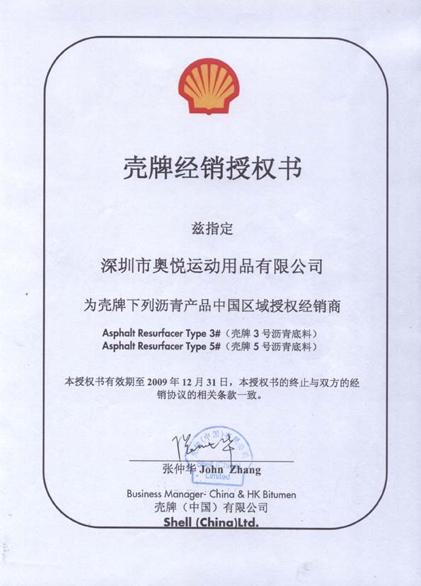 奧悅公司之荷蘭Shell殼牌中國區(qū)域經(jīng)銷商證書